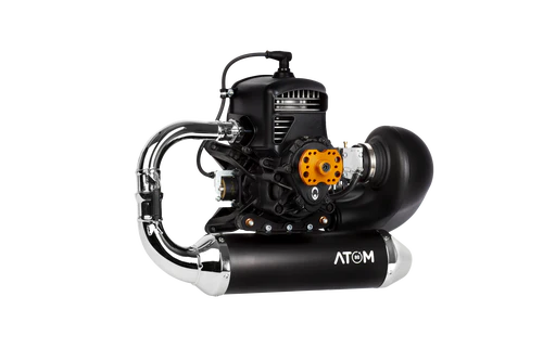 The atom is, by definition, the smallest element, and the center of all energy. That energy, for us, is the best expression of the excitement of those who discover flight for the first time and those who truly appreciate it thereafter. With the ATOM 80 we wanted to revisit the meaning of simple flight and offer an experience with an innovative product that would match. To guarantee this, we studied the new engine in every detail, with regards to reliability and safety. The ATOM is a light quiet engine, well balanced, easy to start with 'Ultrasoft', and packs a punch with low fuel consumption. This was achieved by dedicated research and design coupled with a history of knowledge. The look is modern with innovative materials and production processes, making it stand out from the crowd. Forced air cooled engine, oil bathed helical gear reduction drive, with a centrifugal adjustable clutch. The thrust is smooth, linear delivering 55kg with a 130 cm propeller and 52kg with 125 cm propeller.